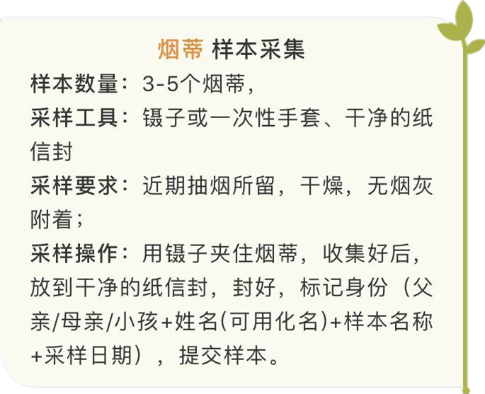 做亲子鉴定样本可包括:血痕、头发、口腔拭子、指甲、牙刷、烟蒂、口香糖以及精液等,以下是烟蒂和口香糖的采集要求: 烟蒂的收集要求: 样本数量:3-5个烟蒂...