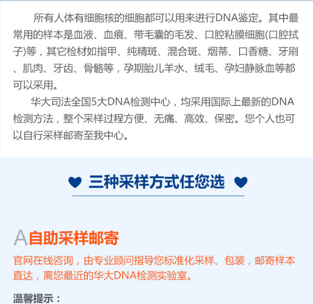 华大鉴正全国5大DNA检测中心,均采用国际上最新的DNA检测方法,整个采样过程方便、无痛、高效、保密。